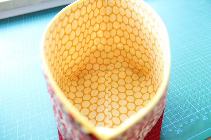 Passend zum Marienkäfer-Stoff habe ich einen dunkelroten Pünktchen-Stoff für den unteren Taschenbereich ausgesucht und für das Innenfutter einen mit großen gelben Punkten. Er mutet ein bischen wie Bienenwaben an und passt ganz gut zum Insekten-Thema.