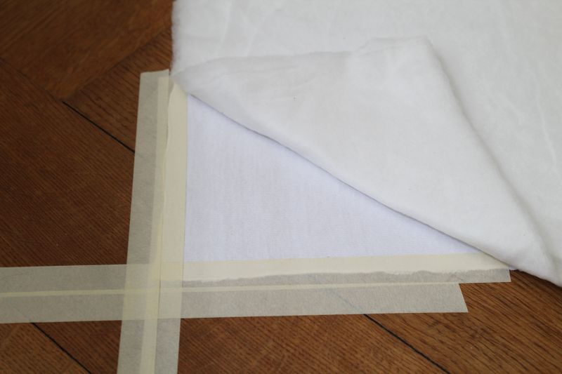 Der Rückseitenstoff wird mit gebügelt und mit Malerkrepp faltenfrei auf dem Boden oder auf einen großen Tisch fixiert. Danach wird das Volumenvlies daraufgelegt und auch hier alle Falten ausgestriffen. ich habe diesmal das Baumwollvlies 277 von Freudenberg ausprobiert und finde es etwas dünn. Ist vielleicht Geschmackssache aber 8mm sind das an den meisten Stellen nicht. Einen Versuch ist es wert. Für die anderen Quilts habe ich bisher das Baumwollvlies von Westfahlenstoffe verwendet. Das hat mir besser gefallen, war aber relativ schwer zu verarbeiten beim Quilten.