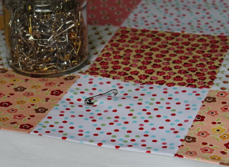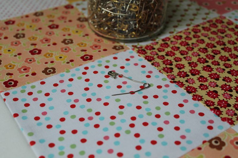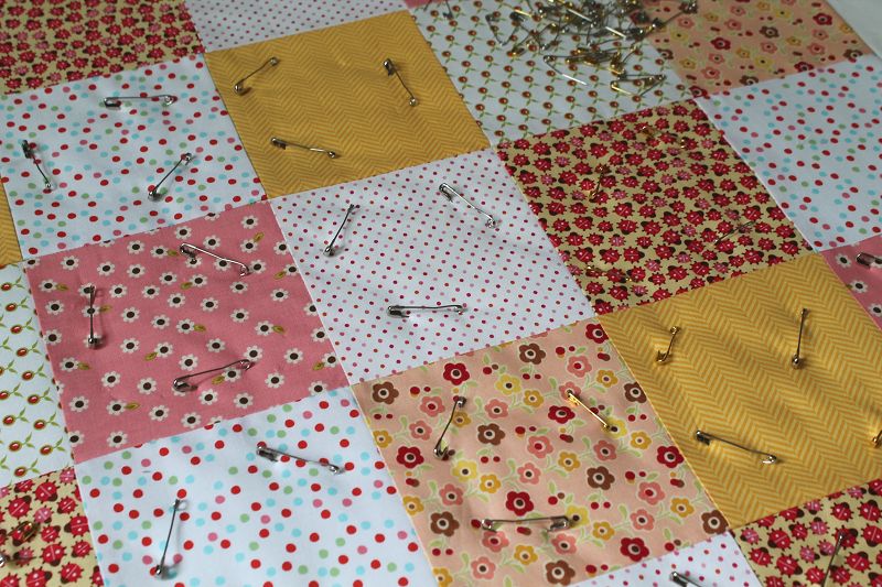 Jetzt kann geheftet werden. Um die drei Lagen vor dem Quilten fest zu verbinden gibt es unterschiedliche Methoden. Man kann mit einem groben Faden heften, mit Basting-Spray die Lagen verkleben oder mit Sicherheitsnadeln arbeiten. Letzteres ist meine bevorzugte Methode. es gibt spezielle gebogene Sicherheitsnadeln für das Quilten.