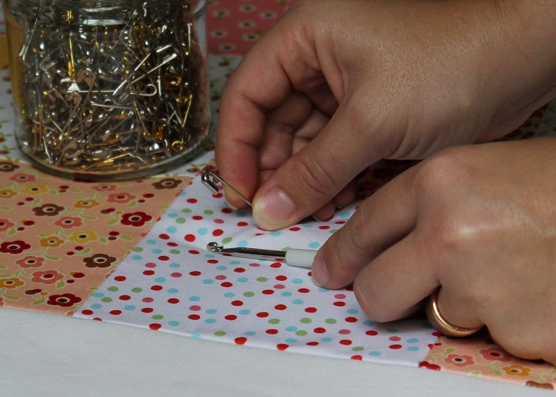 Die Nadeln werden durch alle drei Lagen befestigt. Damit beim Schließen der Nadeln die Stofflagen nicht hochgehoben und verschoben werden, gibt es einen Trick. Man kann ein Werkzeug namens Kwik Klip nehmen oder wie ich eine Häkelnadel. An der Stelle, wo die Spitze der Nadel wieder nach oben kommt, wird das Werkzeug positioniert und dann muss die Sicherheitsnadel nur noch nach unten gedrückt werden und rastet wie von selbst ein.