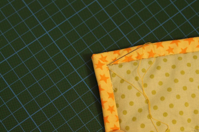 Auf diese Art wird das Binding auf der Rückseite mit der Hand festgenäht, immer direkt unter der Ausstichstelle auf der Kante wieder in den Quilt einstechen und 0,6cm entfernt wieder hochkommen und dabei wieder genau die Kante erwischen. So wird die Kante fast unsichtbar fixiert. An den Ecken wird bis zum Nahtrand genäht.