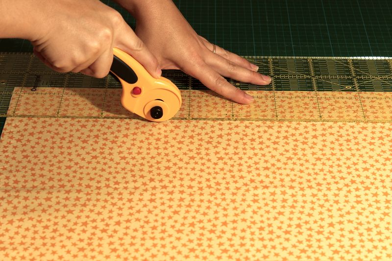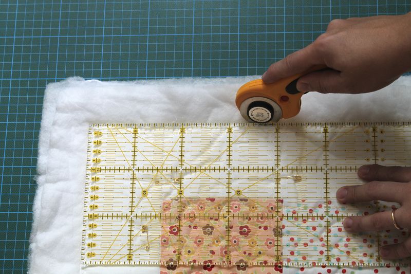 Vor dem Binden muss der Quilt noch zugeschnitten werden. Dabei werden alle überstehenden Reste von Backing und Batting (Rückseite und Volumenvlies) abgeschnitten und der Quilt in eine viereckige Form gebracht. Das heißt an den Ecken muss besonders auf einen rechten Winkel geachtet werden. Damit das optisch passt, sucht ihr euch am besten eine Referenzlinie auf dem Quilt. Ich habe die Grenze zwischen Muster und Randstück genommen.