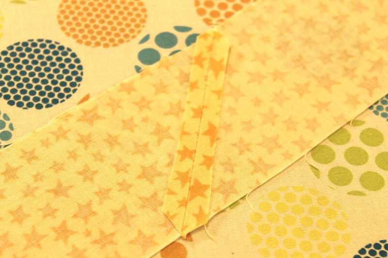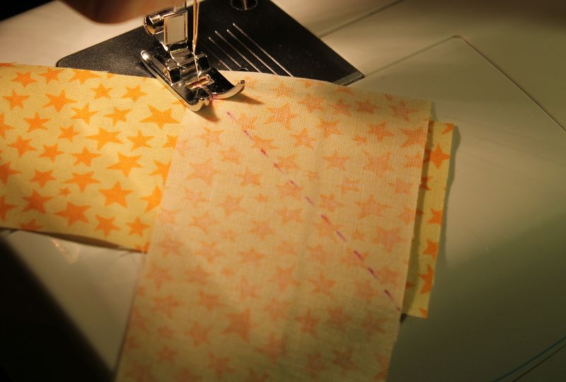Die Enden werden rechts auf rechts im rechten Winkel aneinander gelegt und von links oben nach rechts unten diagonal zusammengenäht. Man kann hier auch stecken, bei so kurzen Nähten mache ich das meistens nicht. Hier bietet sich wieder die Chain-Piecing-Methode an.