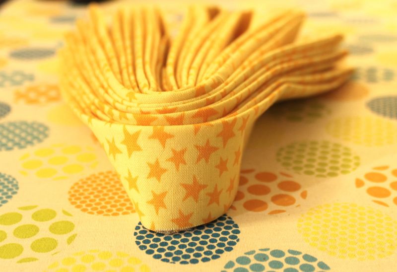 Mein Stoff für das Binding hat eine Länge von 104cm ich benötige also 454cm : 104cm = 4,4 ~ 4,5 Streifen davon. Für das Binding benötigen wir eine Breite von 6,5cm. Die werden mit der bekannten Methode zugeschnitten.