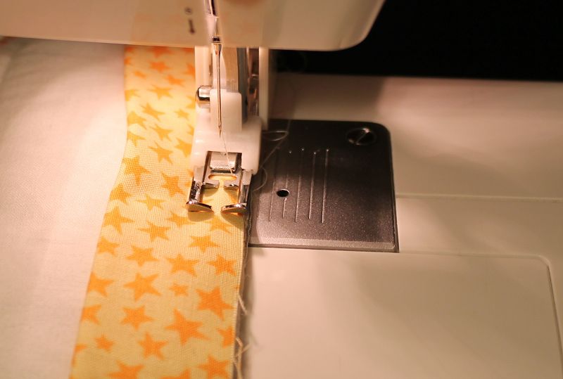 Jetzt wird der Streifen auf der Vorderseite des Quilts angebracht. Dabei wird er mit der offenen Seite an den äußeren Rand gelegt und nähfüßchenbreit aufgenäht. Am Anfang werden ca. 15cm nicht befestigt, die benötigen wir dann beim Zusammennähen. Ich nähe hier wieder mit dem Obertransportfuß.