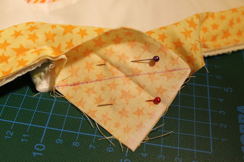 Dann wird wieder von Beginn an nähfüßchenbreit an der Kante entlanggenäht. Dies wird für alle Ecken wiederholt. An der Stelle, an der der Stoffstreifen zusammentrifft, wird wieder ein Rest von ca. 15cm nicht festgenäht. Mit den zwei Enden wird der Streifen jetzt verbunden, so dass kein Übergang sichtbar ist. Dazu werden die Enden übereinandergelegt und so zugeschnitten, dass eine Überlappung genau in Stoffstreifen-Gesamtbreite entsteht (also 6,5cm). Jetzt wird der Streifen aufgefaltet und rechts auf rechts im rechten Winkel aufeinandergelegt. Dieser Schritt ist etwas schwierig und erfordert Übung. Ich benutze hier immer Stecknadeln, auch Stylefix kann hier hilfreich sein. Auf jeden Fall sollte man ausprobieren, ob der Streifen nicht verdreht ist, bevor man näht.