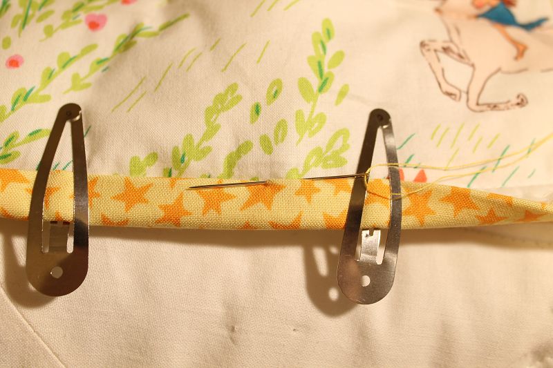 Der freie Streifen wird dann noch festgenäht und somit ist der Streifen auf der Vorderseite komplett befestigt. Dann wird die freie Kante auf die Rückseite geholt und mit Klammern befestigt.