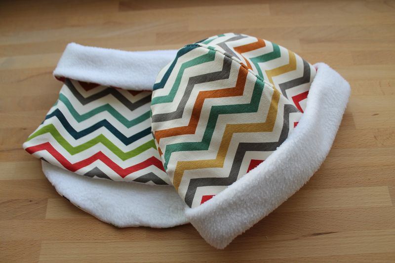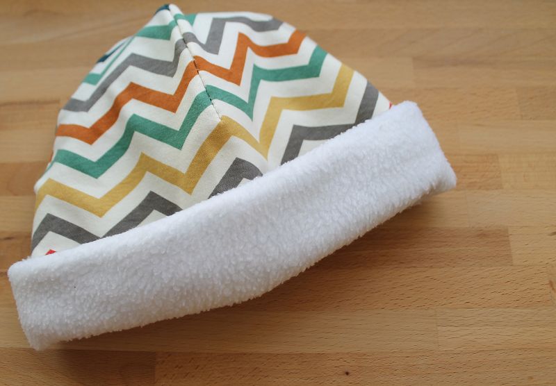 Der Außenstoff ist ein sehr schöner Bio-Jersey von Birch Just For Fun in ZickZack-Muster. Der Stoff ist etwas dicker als anderer Jersey und daher für eine warme Mütze super geeignet. Um die Mütze richtig warm zu bekommen habe ich für das Innenfutter warmes Polar Fleece genommen.
