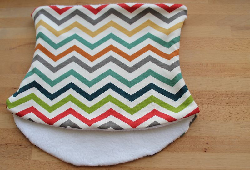 Der Kuschel-Schal aus den selben Stoffen wurde von mir etwas abgeändert, dann ist er nicht mehr ganz so Easy Peasy aber gefällt mir so besser. Statt nach der Anleitung das Vorder- und Rückteite separat zusammenzunähen und die beiden and den Seiten zu verbinden, habe ich mit Wendeöffnung gearbeitet und den Schal verstürzt.