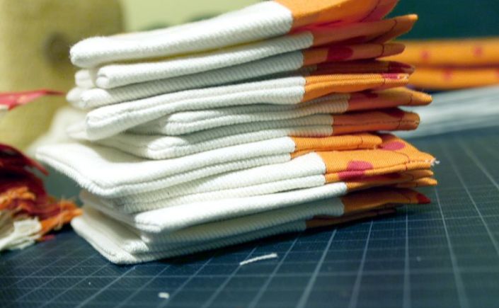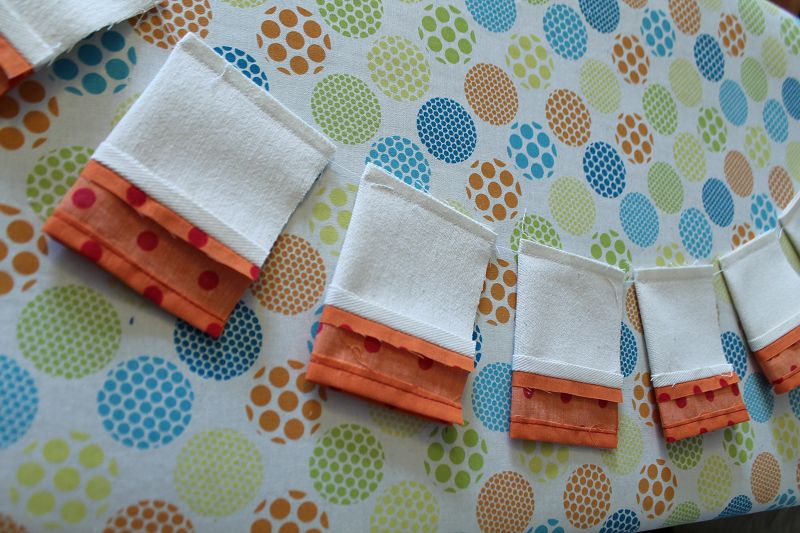 Für den oberen Stoff habe ich Punkte-Stoffe in orange und rot genommen, die dann gemischt werden sollen.