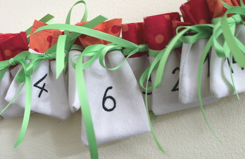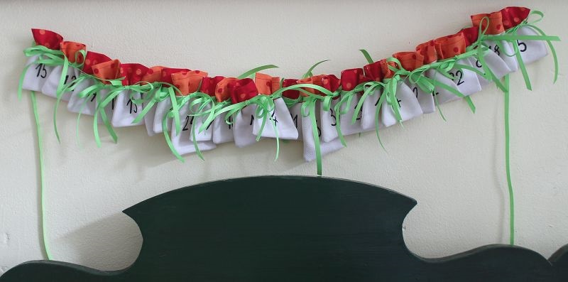 Endlich hatte ich Zeit die Adventskalender aus Stoff für meine Töchter fertig zu nähen. Die Anleitung dazu habe ich von Pech und Schwefel. Da wir die Kalender traditionell mit Süßem füllen, habe ich sie um die Hälfte kleiner gemacht, soll ja nicht zu viel werden. Jetzt passt in jedes Säckchen eine kleine Süßigkeit. Die Säckchen werden mit Bändern zugeschnürt, die auf der Rückseite eine Schlaufe bilden, mit der sie befestigt werden können.