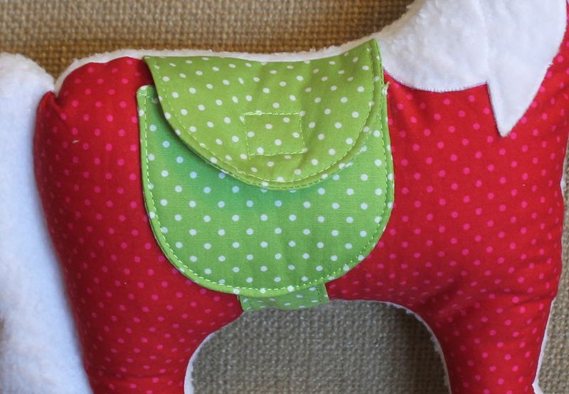 Auf dem Rücken hat das Kuschelpferd eine Tasche, in die man Kleinigkeiten hinein tun kann und die mit einem Klettverschluss geschlossen wird.