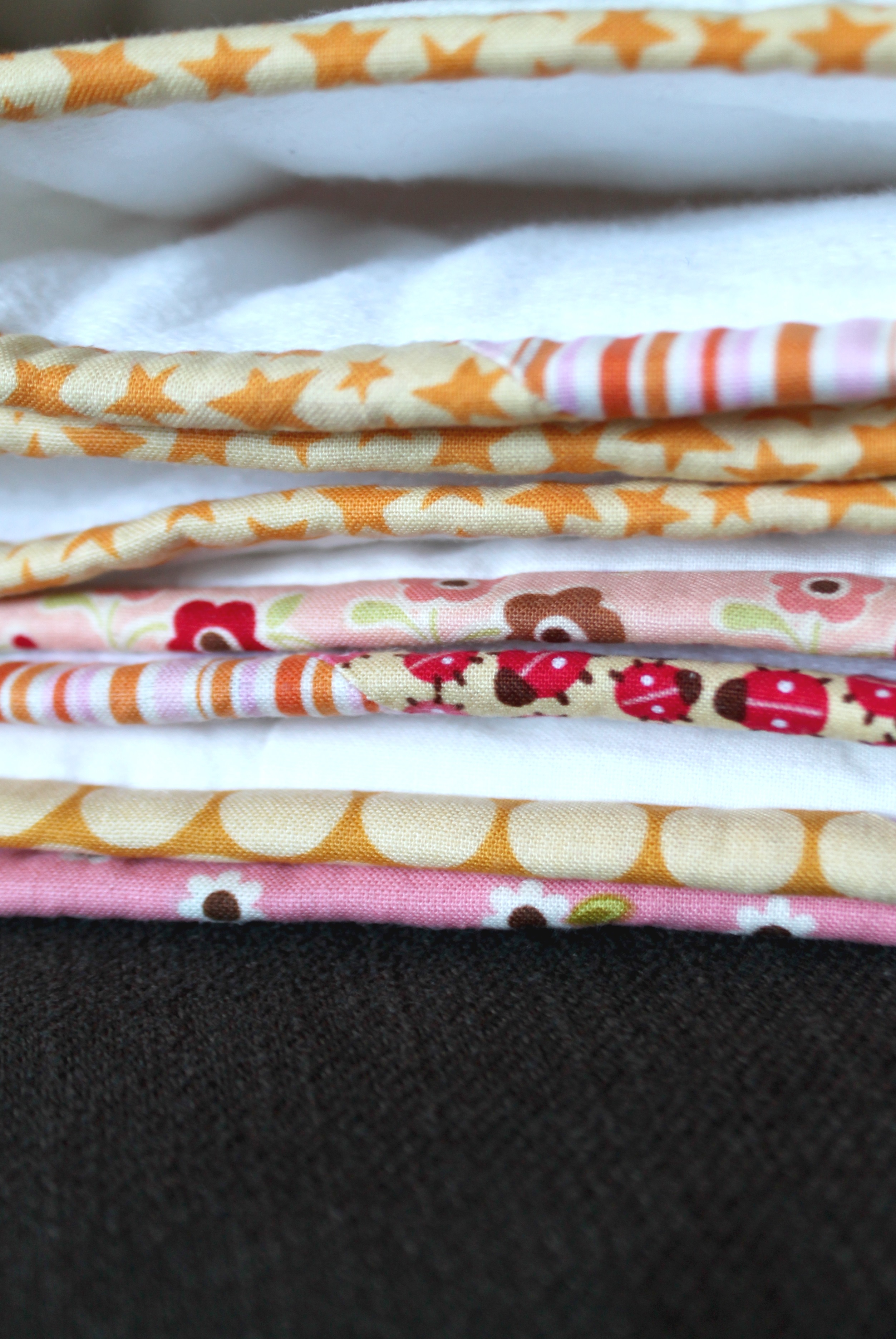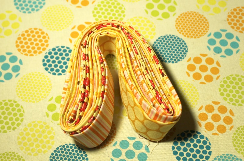 Die Breite der Streifen ist 6,5 cm, das gibt ein ca. 1cm breites Binding. Die Längen sind unterschiedlich, je nach den Stoffresten, bei mir zwischen 25 cm und 50 cm.