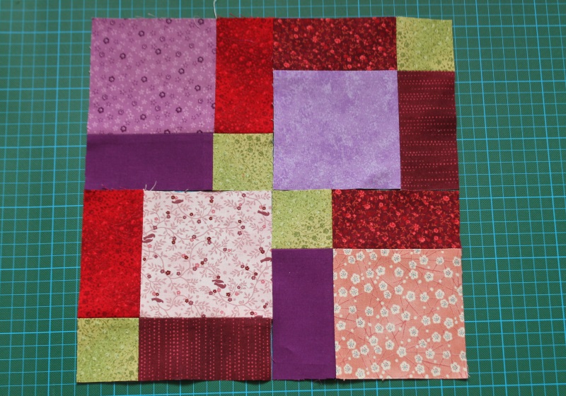 Als Grundlage für das Patchwork-Muster „Disappearing Nine Patch“ werden neun Quadrate zu einem großen Quadrat zusammengenäht. Bei der Auswahl der Farben habe ich darauf geachtet, dass in der Mitte eine Kontrastfarbe liegt und die dunkleren Farben in die Mitte der Reihen sind.