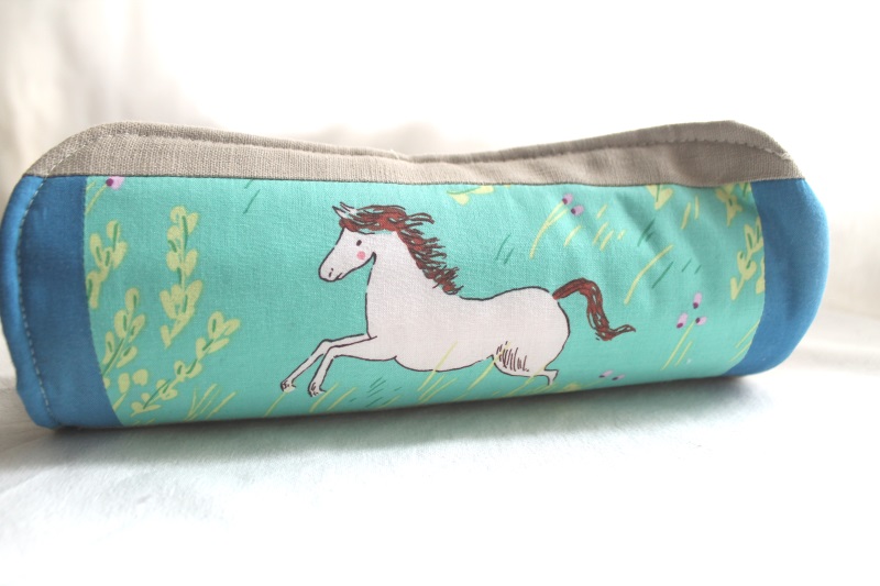 Für den Dekostreifen auf der Außenseite habe ich wieder einen Pferde-Stoff aus der Wee Wander Serie von Sarah Jane für Michael Miller genommen. Diesmal den grünen, da grün-türkis gerade die Lieblingsfarbe meiner Tochter ist.