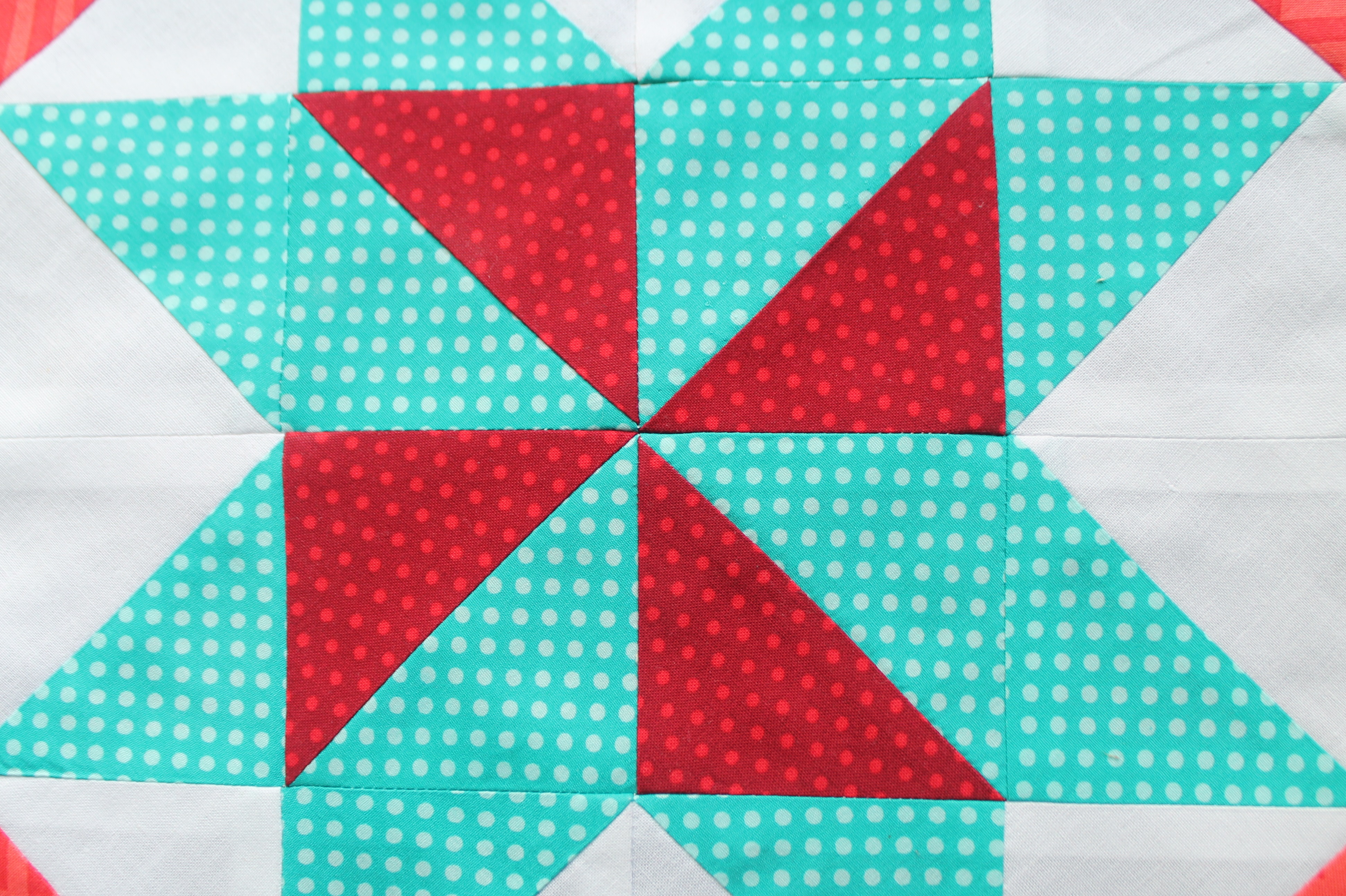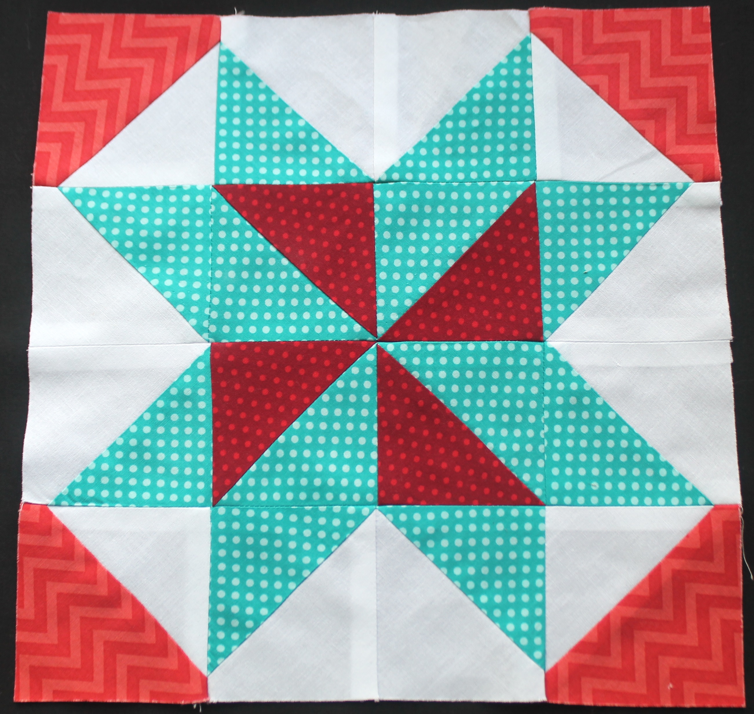 In diesem Monat wollte ich einen Stern nähen und bin auf diesen Block mit Anleitung von The Quilt Ladies gestoßen. Anstatt einfarbig habe ich ihn mit drei Farben genäht und dabei den Windrad-Effekt in der Mitte betont.
