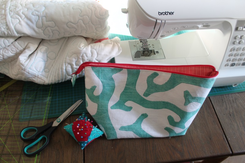 Nach dem Aufstehen und einem Abstecher im Bad komme ich an meinen Nähprojekten von letzter Nacht vorbei, ist mal wieder etwas später geworden. Eine Kosmetiktasche die zur Strandtasche passt und ein bisschen Quilting am werdenden nächsten Wee Wander Quilt.