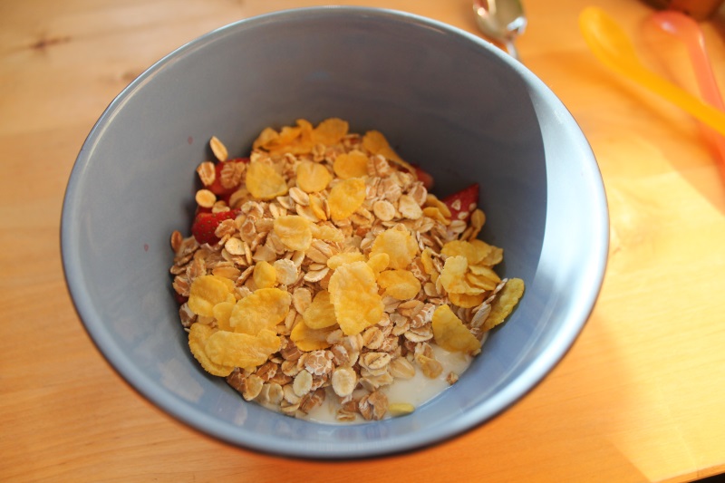 Zum frühsommerlichen Frühstück gehört auch ein Müsli mit Erdbeeren und ein Blick auf die sonnenbeschienenen Blumen vor dem Fenster.