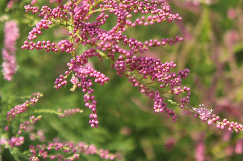 Ich glaube was du meinst ist der Liebesperlenstrauch. Dieser hier ist eine Tamariske und blüht später noch auf (eine kleine Blüte sieht man im ersten Bild schon).