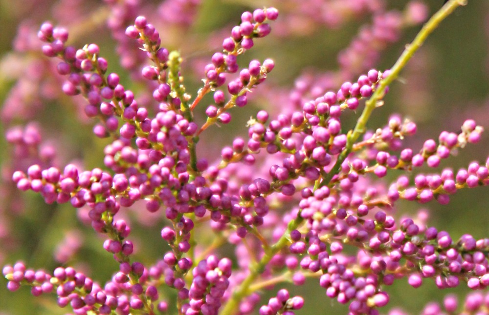 Edit: Ich habe nachträglich noch herausgefunden, dass es sich um eine Tamariske handelt, ein Mittelmeer-Strauch. Ich habe ihn auch in Italien fotografiert. Ein Bild von den geöffneten Blüten findet ihr hier: http://www.meine-orangerie.de/mediterrane-pflanzen/mediterrane-geholze/tamariske-olyuser/