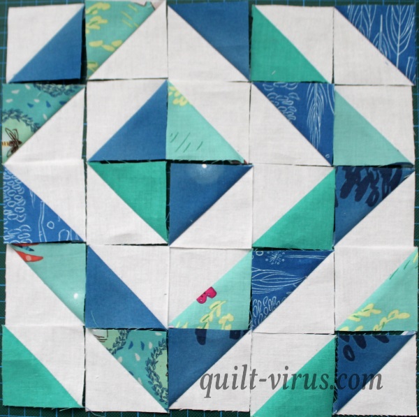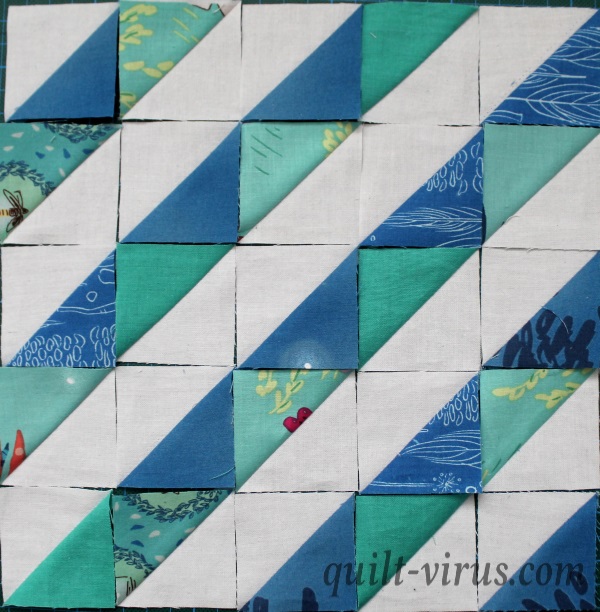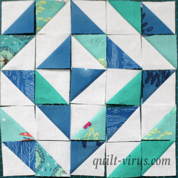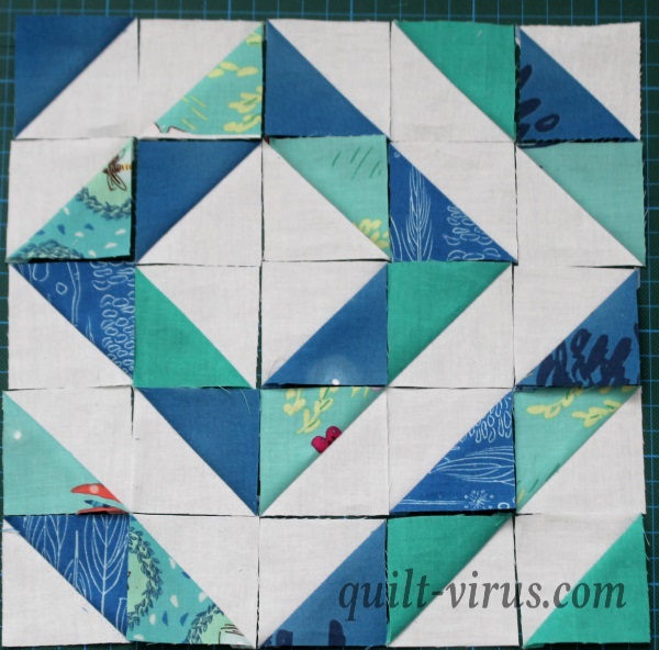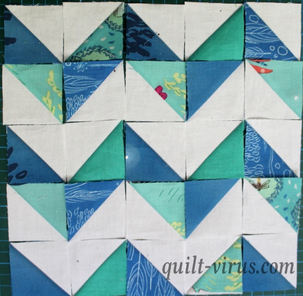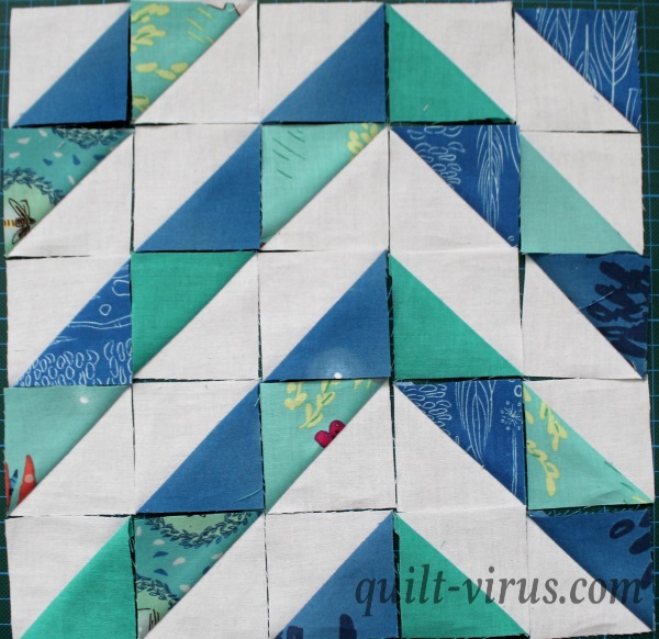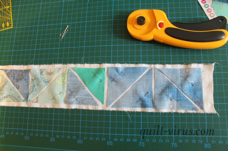 Wer schon mal ein Scrappy Binding für einen Quilt gemacht hat, weiß, dass beim Zusammennähen der Stoffstreifen viele kleine Dreiecke entstehen. Was liegt da näher als Half-Sqare-Triangles daraus zu machen, Stoffquadrate die aus verschiedenfarbigen Dreieck-Hälften bestehen.