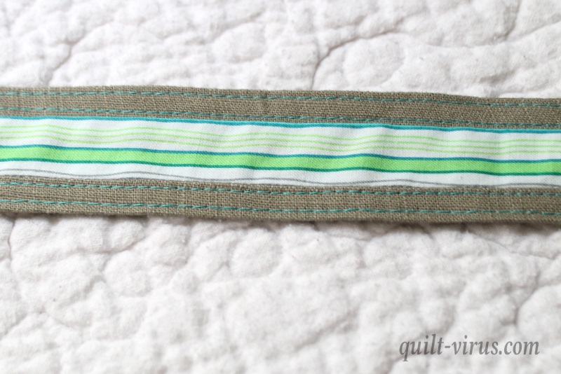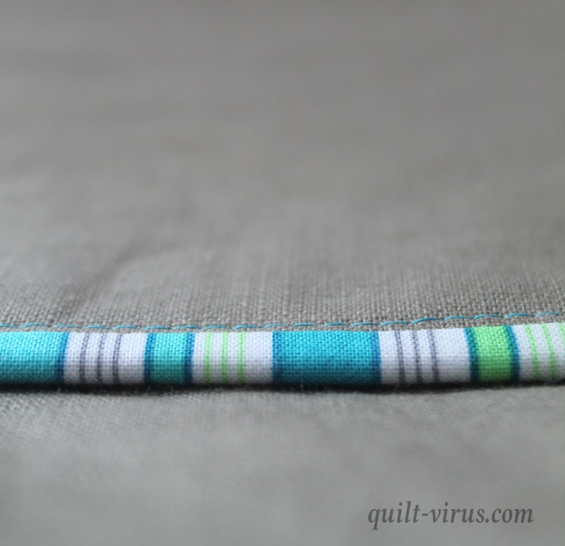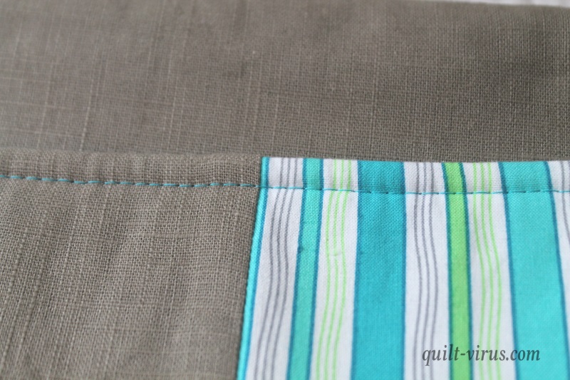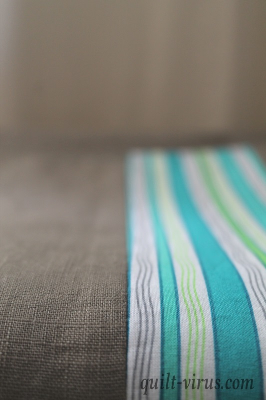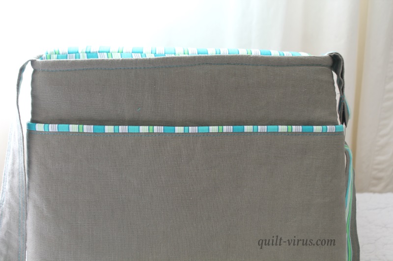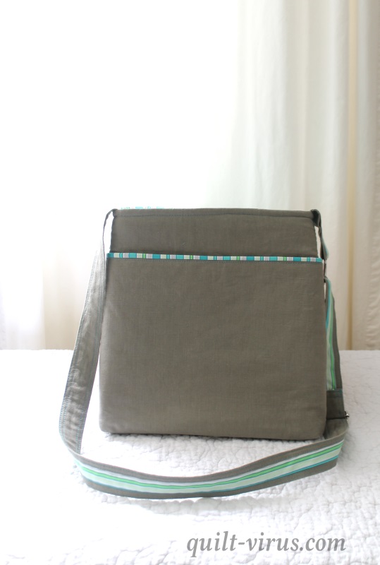 Außen habe ich überwiegend Leinen in dunkelbeige benutzt, unterbrochen von einem Streifen grün-türkisen Patchworkstoffs „Gypsy“ von Exclusively Quilters. Versärkt wurde die Tasche wieder mit Soft and Stable.
