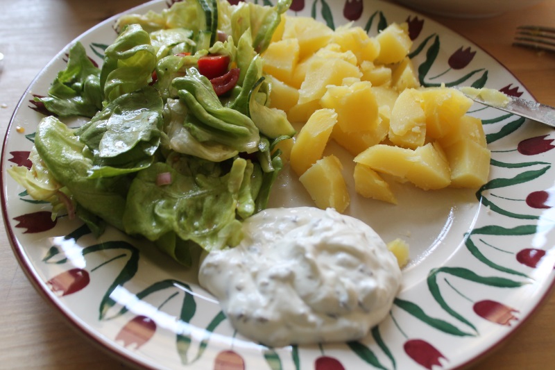 Vormittags einen T-Shirt Schnitt für die Kleine herausgesucht und das Schnittmuster ausgedruckt und ausgeschnitten. zum Mittag Kartoffeln mit Quark und Salat, bei uns sehr beliebt.