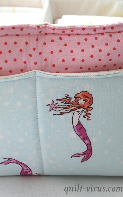 Für die Korb-Außenseite habe ich deshalb einen Stoff von Ikea ausgesucht, rosa mit roten Punkten. Bei der Vordertasche habe ich passend dazu einen ganz süßen Stoff verwendet, den Sarah Jane für Michael Miller entworfen hat: Mermaid play aus der Serie Out to sea.