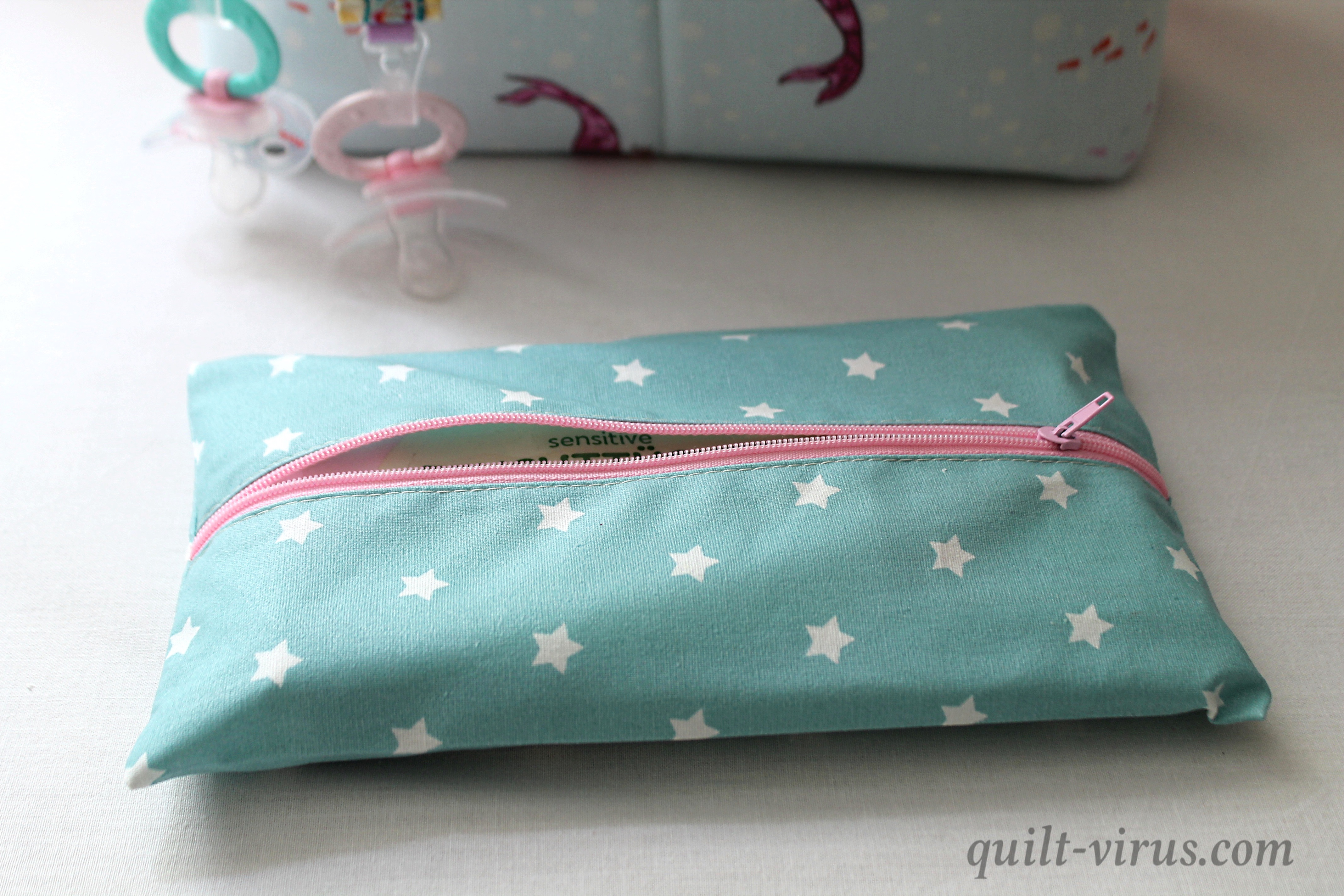 Nach der Anleitung von kleine Fluchten habe ich die Feuchttuchtasche genäht, sie hält die Feuchttücher lange haltbar. Dafür habei ich das schöne Wachstuch mit den blauen Sternen  angeschnitten.