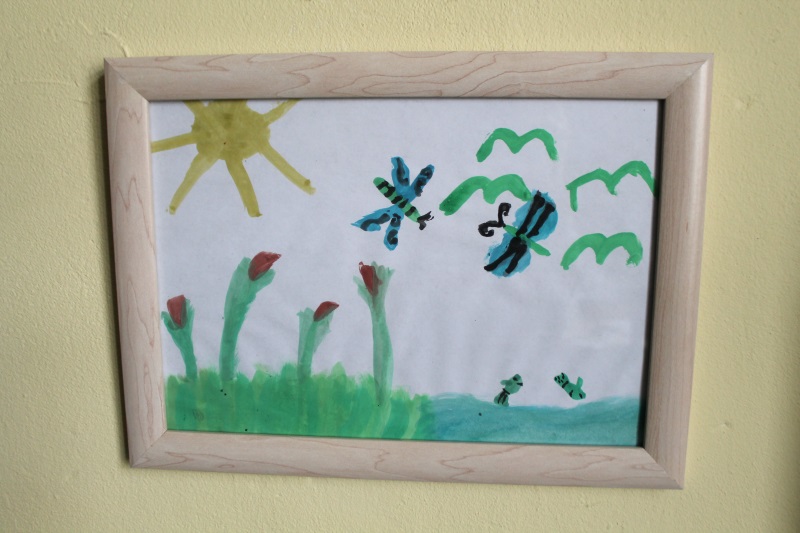 Die Kinder waren schon vor dem Frühstück wieder mal kreativ und ein Werk hat gleich einen Platz an der Wand bekommen. Danach wird neuer Stoff für mein nächstes Projekt gewaschen und gebügelt.