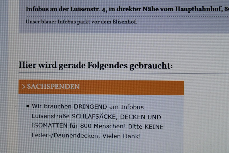 Dann kommt noch etwas dringenderes dazwischen, Es kommen heute so viele Flüchtlinge an, dass sie am Münchner Hauptbahnhof dringend Decken und Schlafsäcke brauchen. Also nochmal los mit allem was der Schrank hergibt. Später wieder zurück zu Hause, runterkommen beim Tatort (irgendwo läuft immer einer).