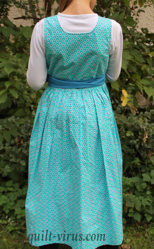 Die Große hat sich aus der Serie den Stoff Little Blossom in Türkis ausgesucht, dazu eine einfarbige blaue Schürze.