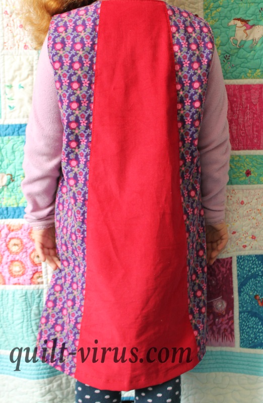Der Schitt ist wirklich denkbar einfach und damit auch für Anfänger geeignet. Kein Reißverschuß und mit Kam-Snaps muss man nicht mal ein Knopfloch nähen. Hinten ist ebenfalls ein Kontrastfarbiger Einsatz. Das gefällt mir sehr.