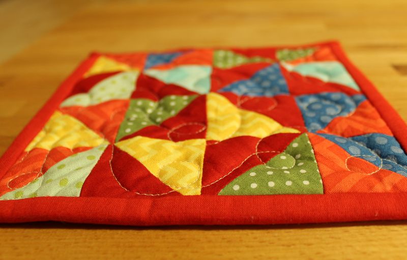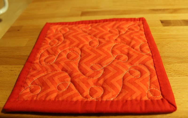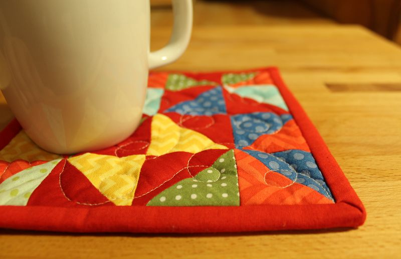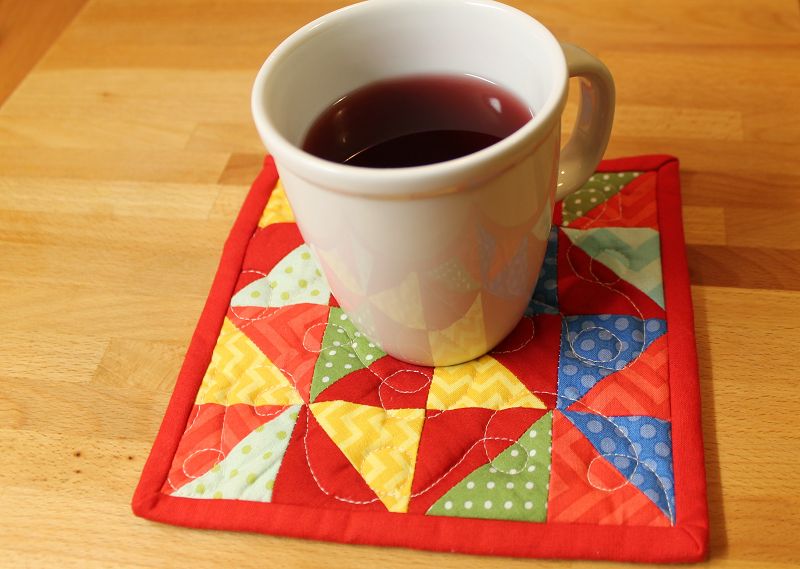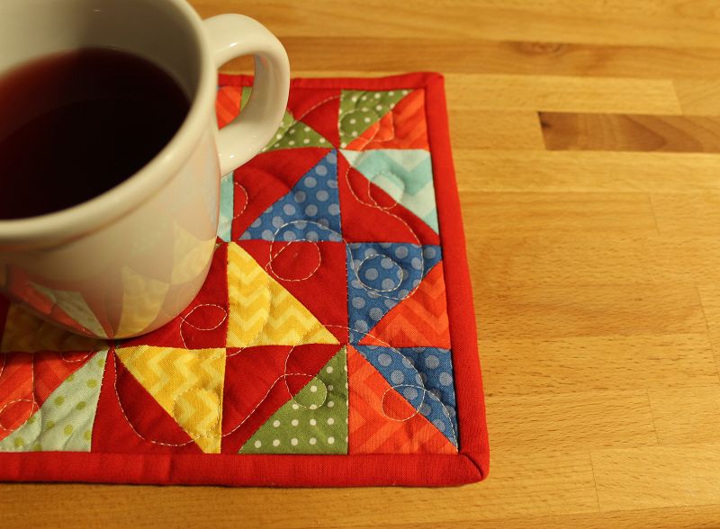 Ich habe den Mug-Rug (Tassenteppich 🙂 ) wie einen Mini-Quilt gemacht. Mit Oberteil, dünner Vlieseinlage und Rückseitenstoff. Gequiltet habe ich ein Muster aus Schleifen.