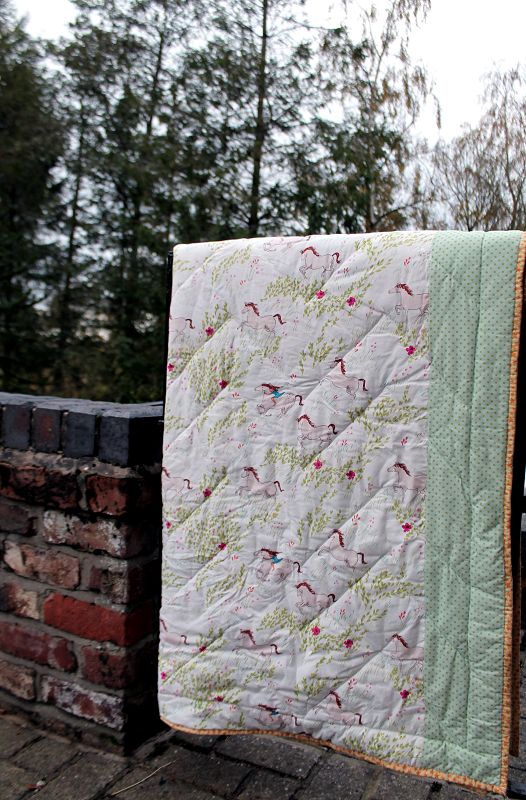 Für die Rückseite habe ich wieder den Pferde-Stoff von Michael Miller genommen „Summer Ride White“. Links und rechts wurde er mit einem Streifen hellgrün mit Punkten eingefasst.