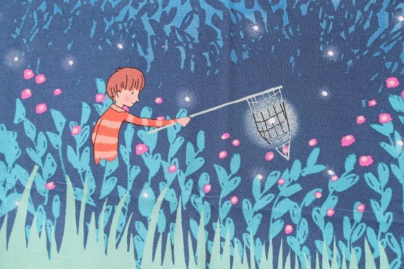 Auf diesem Muster sind Glühwürmchen zu sehen und die Gläser in denen sie gefangen werde und leuchten.